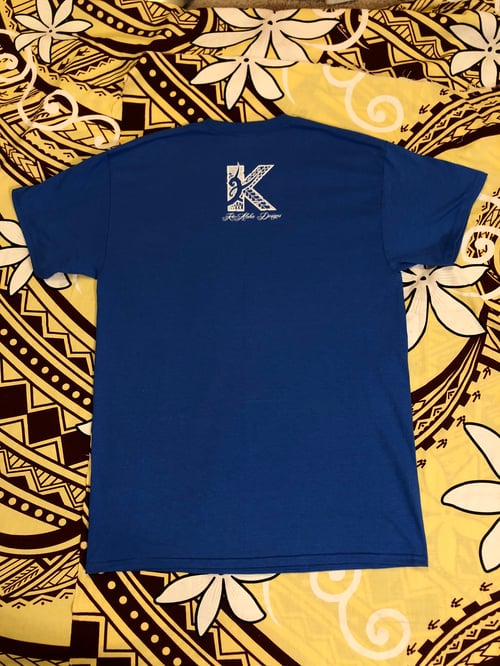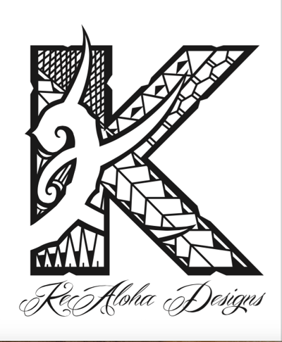 Polynesian Mix print with KeAloha Designs in Old English With Sharks Teeth Above And Below That Represents Protection.